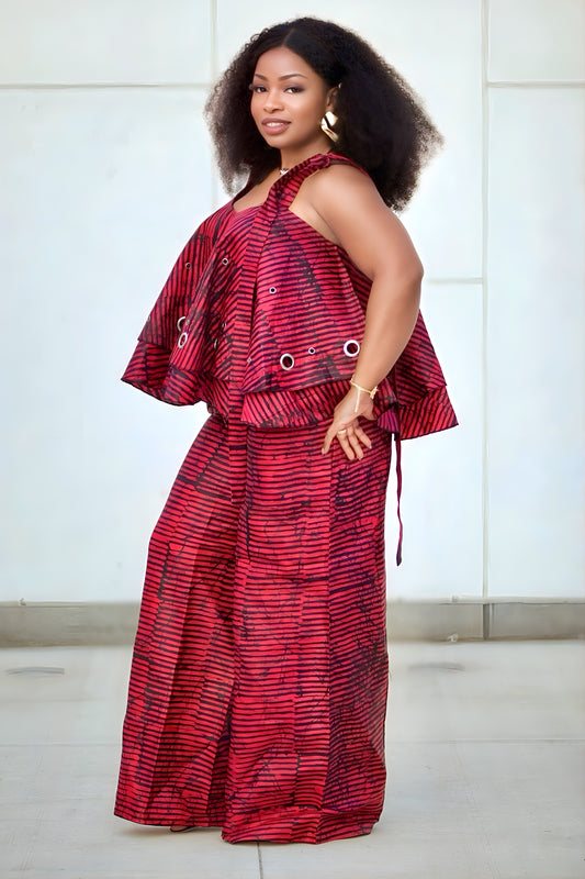 Batik Maroon Sleeveless Jumpsuit – Wide-Leg African Palazzo Look