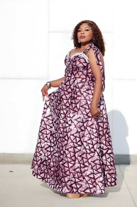 Elegant Ankara Maxi Dress – African Print Gown in Wine Red and Black