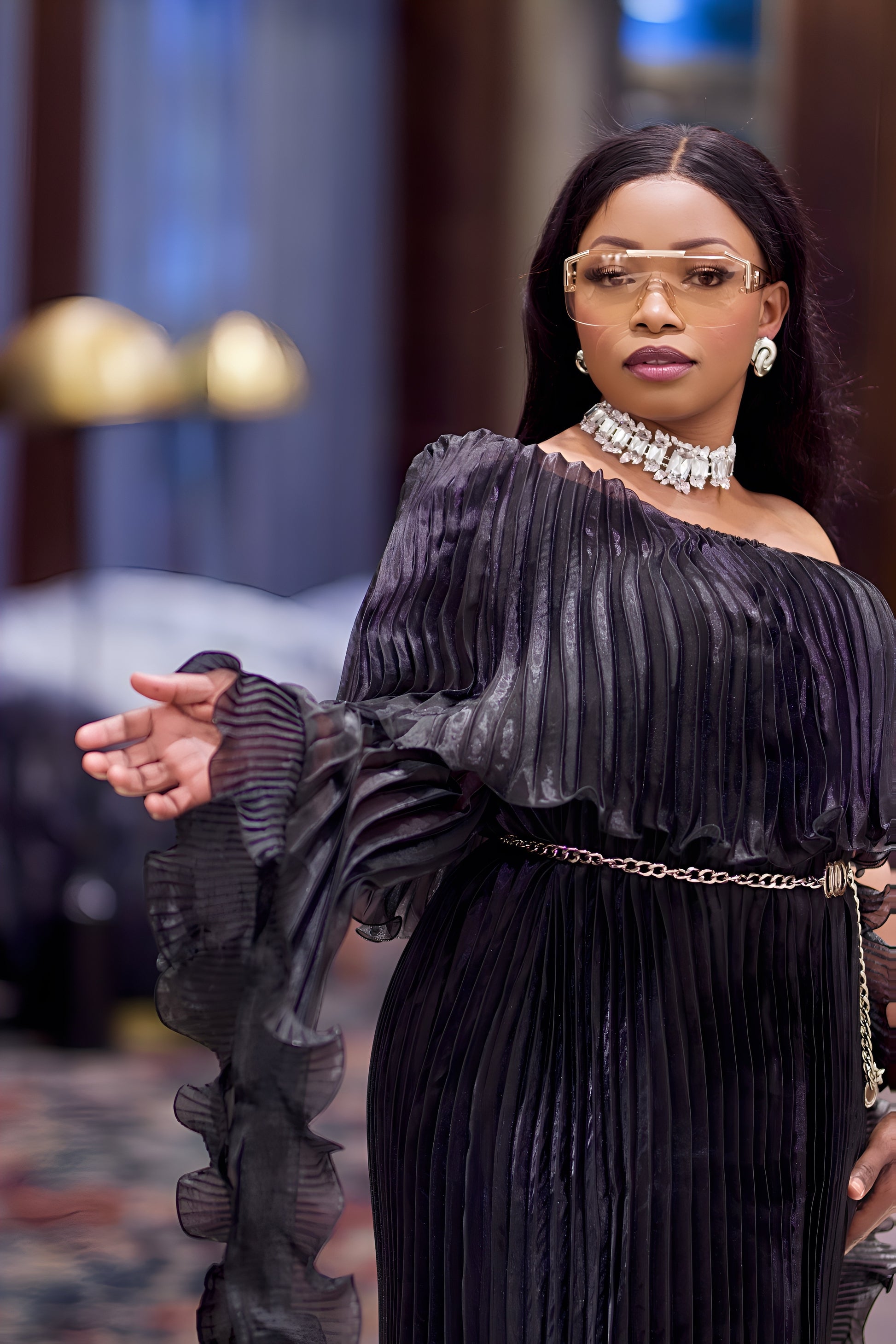 Elevate your evening look with this one-shoulder pleated evening gown, crafted to deliver effortless glamour and a flawless fit. Featuring a dramatic asymmetrical ruffled sleeve, flowing accordion pleats, and a floor-length silhouette, this gown creates an elegant and timeless appeal. A sleek gold chain belt highlights the waist for a touch of refined detail.
