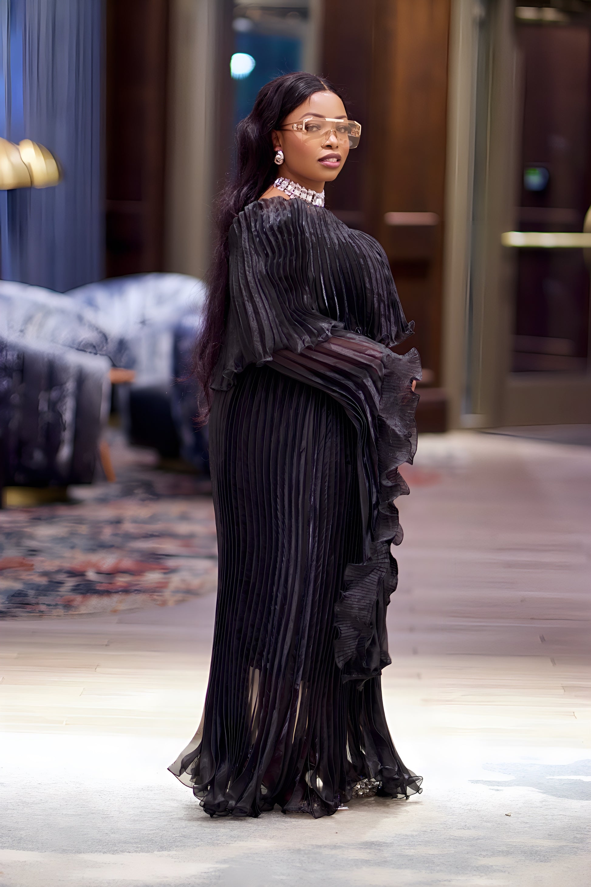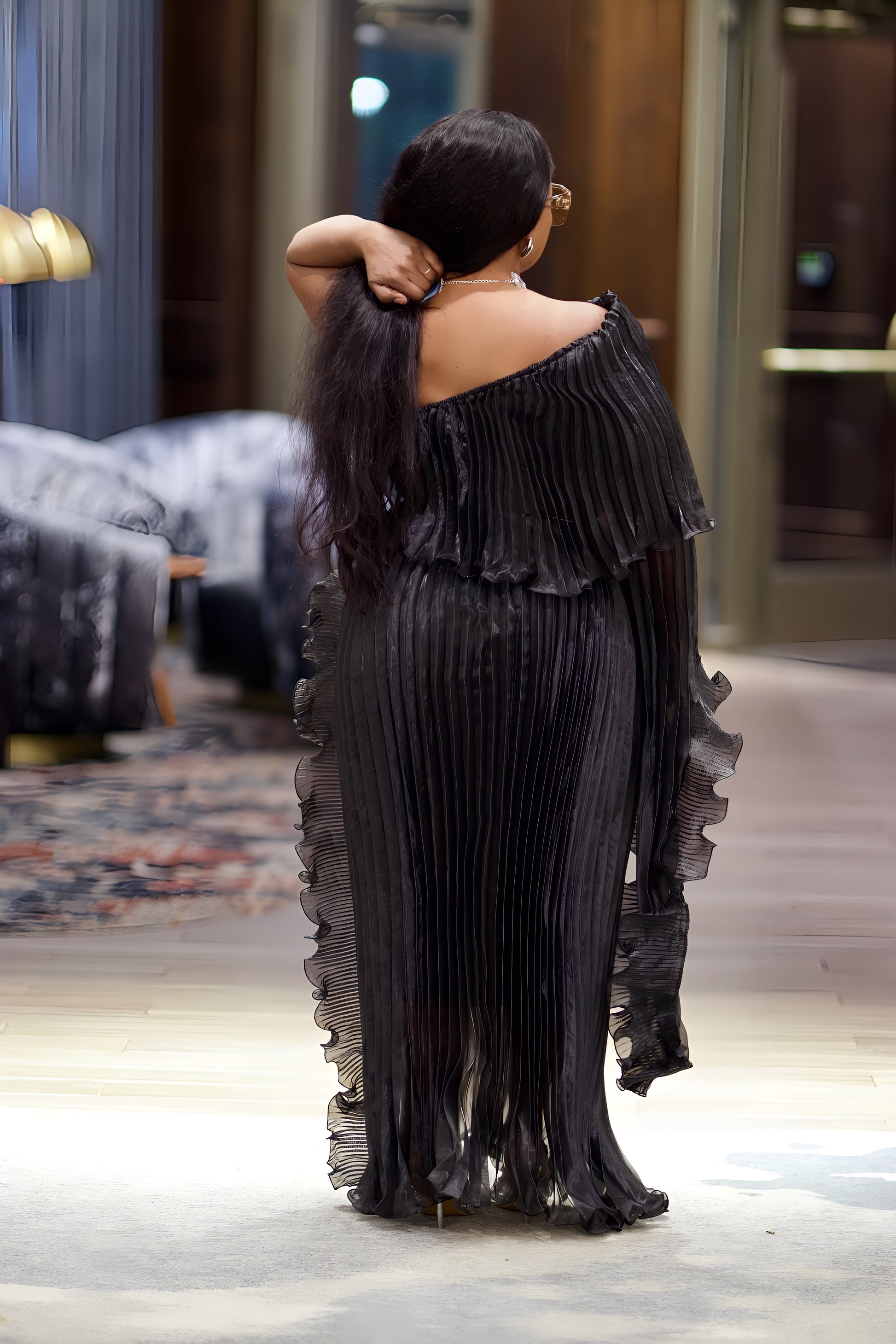 Perfect for weddings, galas, cocktail parties, red-carpet events, and other formal occasions, this luxury pleated gown is available in two stunning colors: Golden Amber for a radiant glow and Midnight Black for classic sophistication.